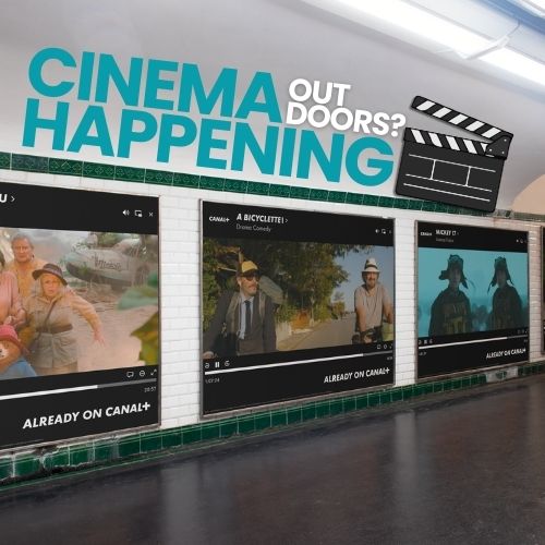 The campaign transforms outdoor spaces into real-life versions of the CANAL+ streaming interface, using paused film frames to show movies already available on the platform.